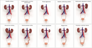 Dị tật phổ biến nhất là tắc nghẽn chỗ nối niệu quản – bể thận, ảnh hưởng đến khoảng 20% số người mắc bệnh. Trong số các loại CAKUT khác , có thận loạn sản đa nang, không có thận, loạn sản thận, thiểu sản thận, trào ngược bàng quang niệu quản, giãn niệu quản, hệ thống thu thập kép, niệu quản lạc chỗ và van niệu đạo sau (Hình 1).
