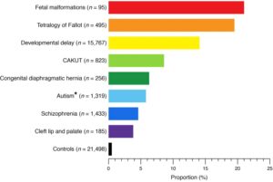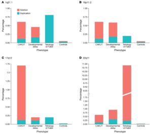 Hình 2. Tỷ lệ bệnh nhân mắc các rối loạn gen đã biết trong các kiểu hình phát triển khác nhau của con người và nhóm đối chứng khỏe mạnh.4